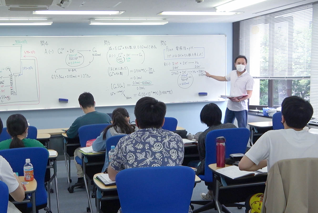 - 授業形式は対話型授業として、常に問題解決能力を育成することに重点を置いて進められます。先生と生徒がともに理解しあいながら進めていくため、消化不良や取りこぼしはありません。1クラスあたりの人数は5名~15名前後です。授業数は単純に大手予備校の1.5倍の時間数を確保しています。